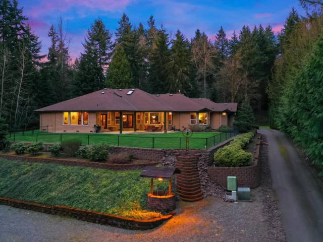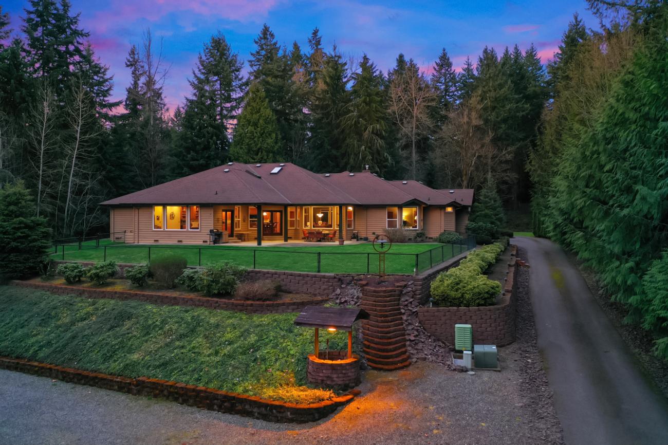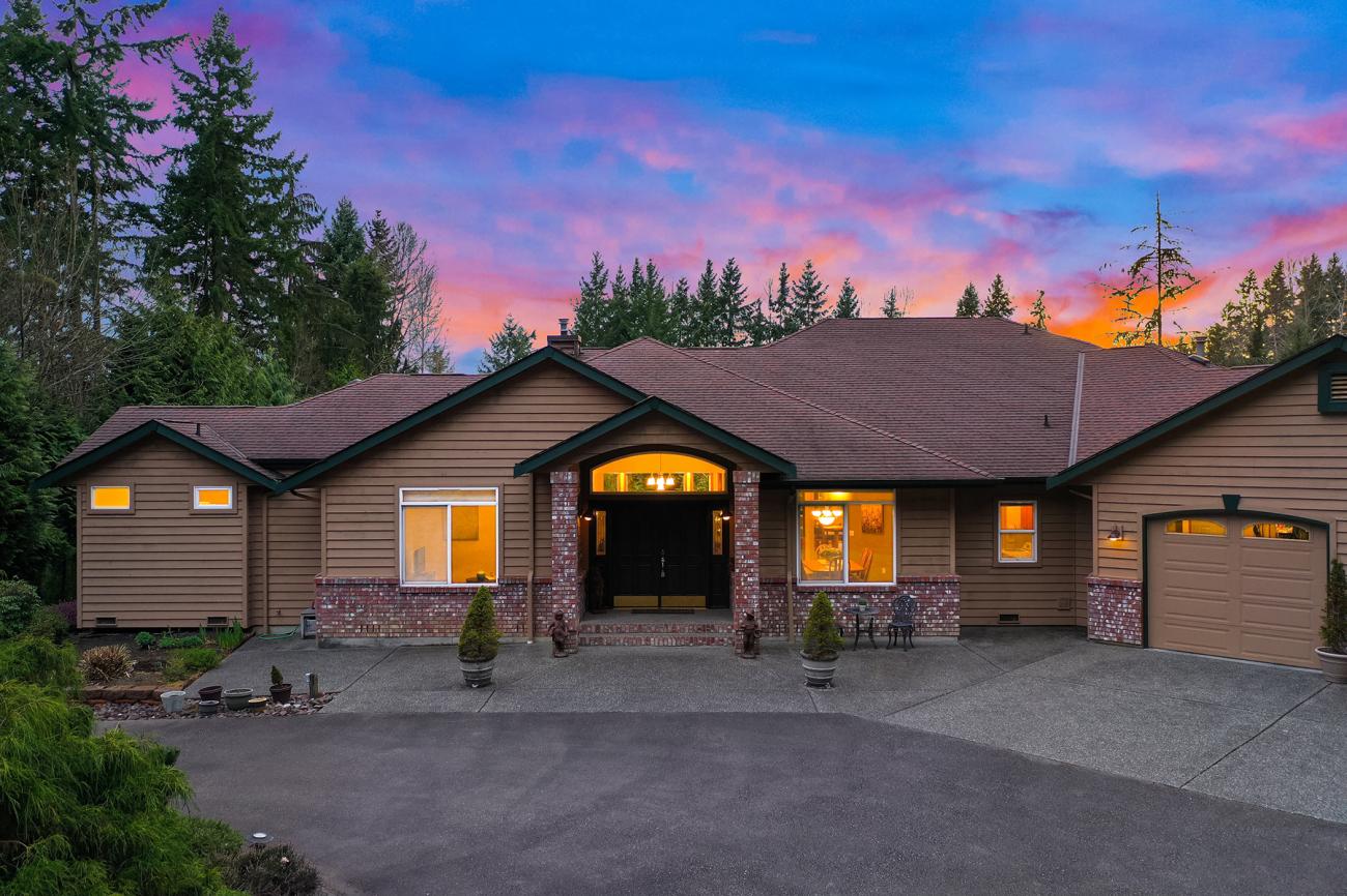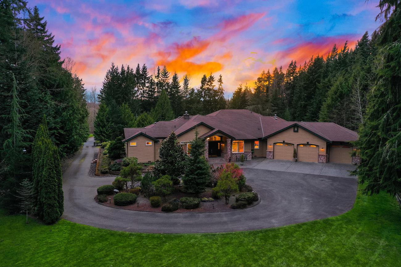 Beautiful, custom built rambler on a park-like, very private, majestically landscaped and secluded, shy 4 acre lot in Maltby! Meticulously maintained home, with spacious, open floor plan boasting more than 3500sqft! Enter through fresh doors into the foyer, marvel at the expansive wall of West facing windows overlooking an amazing covered patio and dream chef's kitchen; open to living room, and family room with built in wet bar, the perfect space to entertain! A huge master suite with spa like bath, 3 extra beds, multiple bathrooms, and a massive 3 car garage round out this opportunity. Close to commuter routes, shopping, dining and outdoor experiences!