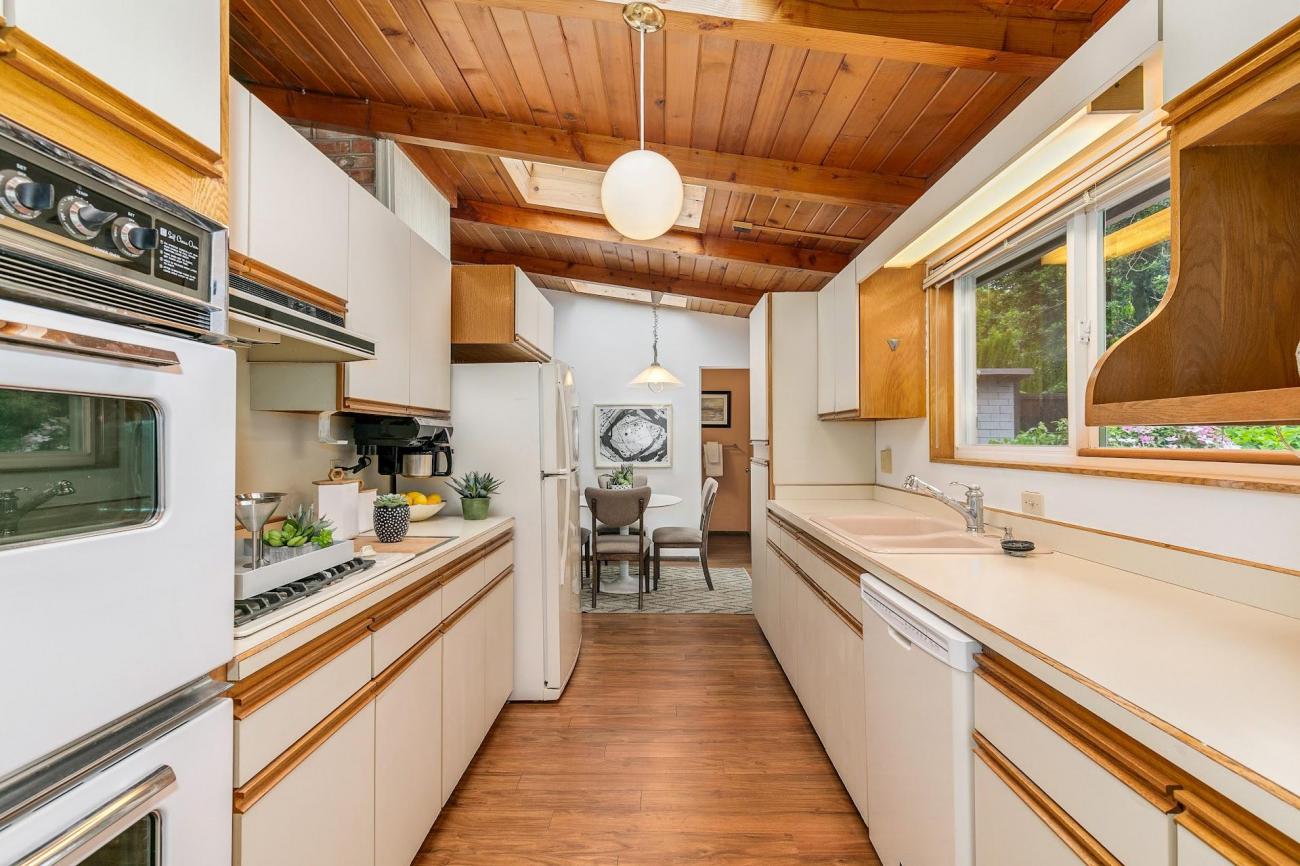 First time on the market in 50 years, this classic Mid-century 3 bed/1.5 bath home offers endless possibilities! Featuring beautiful vaulted ceilings with exposed beams, original hardwood floors, brick wood burning fireplace and spacious family room filled with natural light. Galley kitchen leads to breakfast nook and additional sitting room with custom built ins and spacious laundry. Sliders open to entertaining deck overlooking mature landscaping and beautiful garden. Secluded property on a dead end street with sweeping views of downtown Bellevue from a future second story! Prime location, walking distance to downtown Bellevue, Microsoft, parks and shopping. Award winning Bellevue Schools.